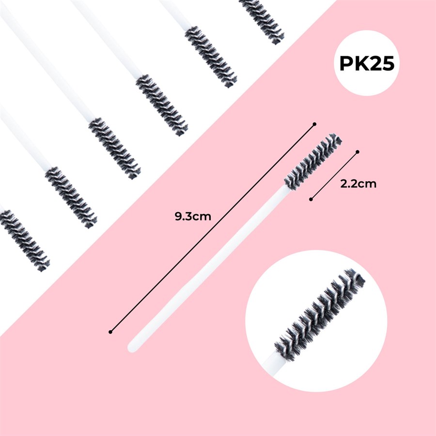 A 25 pack of fine wands which can be used with all brands of mascara. This includes dual level lash extending types and waterproof mascara.