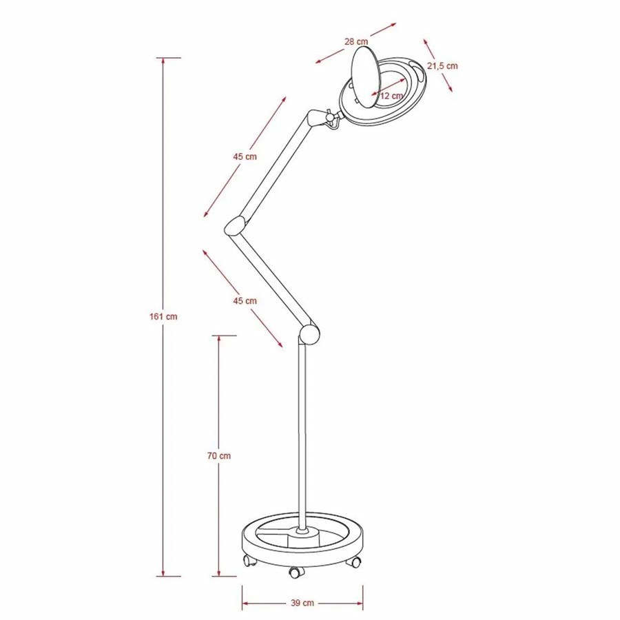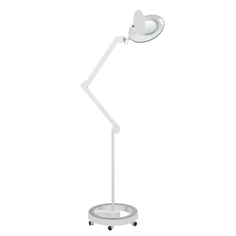 A 5-dioptre LED magnifying lamp of cold light. It is equipped with an articulated arm & a very stable five wheel compact base. Lamp has 60 LED bulbs & its luminous LED is 760 lumen with 8w power.