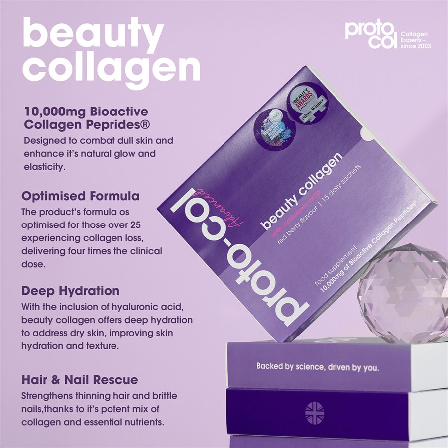 Tired of fine lines and dull skin? Protocol award-winning beauty collagen delivers 10,000mg VERISOL® Bioactive Collagen Peptides, Hyaluronic Acid and vitamins to boost skin elasticity , reduce wrinkles, and strengthen hair and nails.