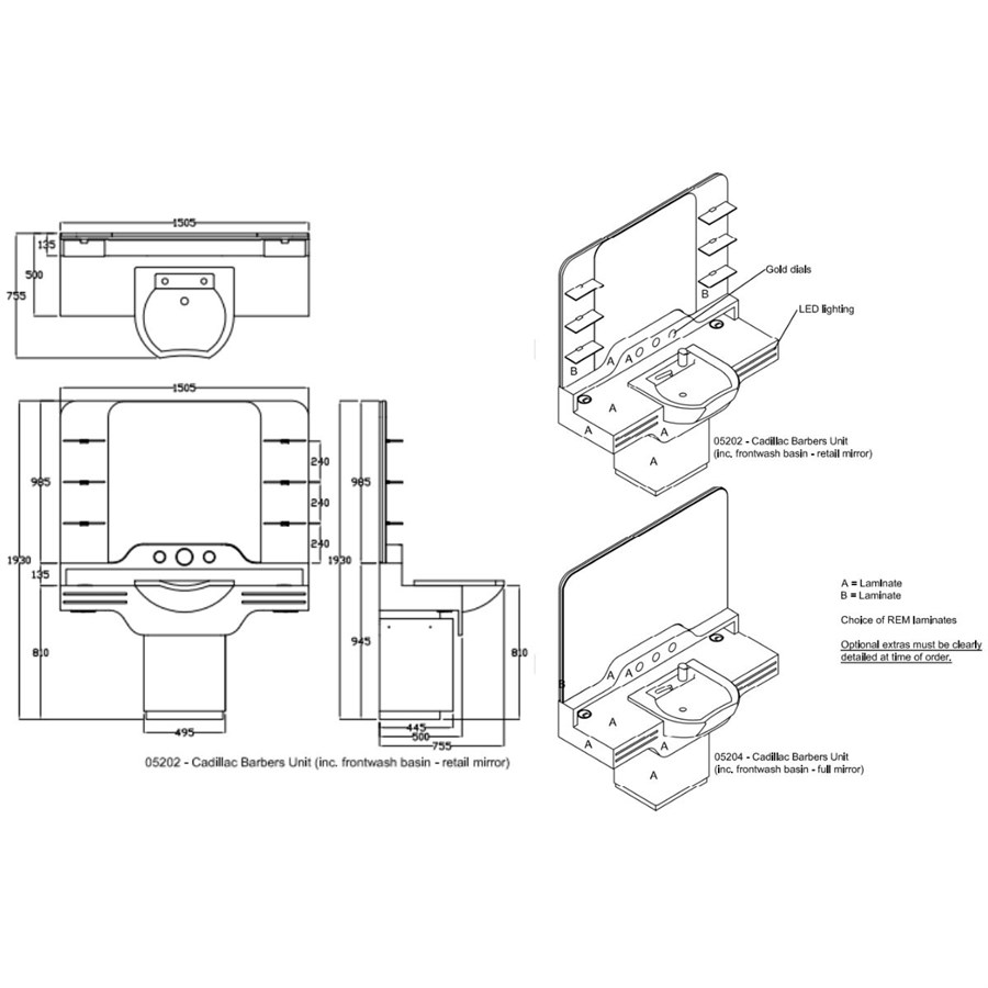 The Cadillac's iconic styling comes complete with the Traditional REM Frontwash Ceramic basin, monobloc & handspray, feature LED lighting and six glass retail shelves. As an added feature the laminated splashback houses Gold Retro dials displaying Time, Temperature and Humidity. Choose from 25 laminate colours, or purchase as a full-mirror version if preferred.