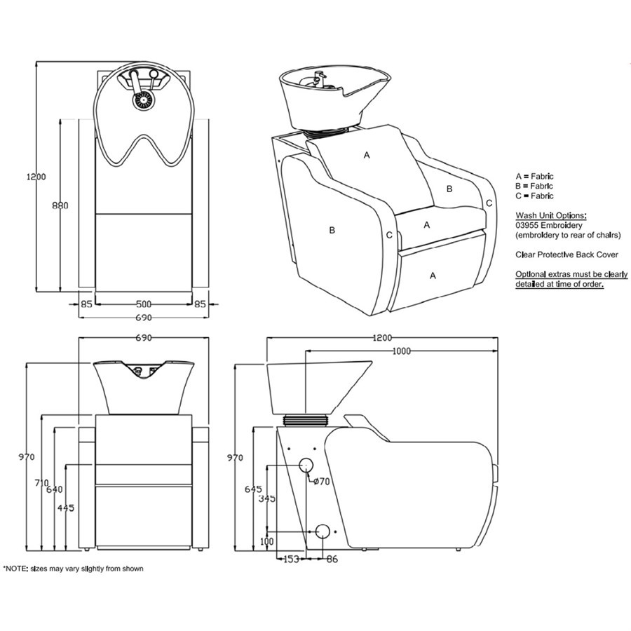 Complete with a water saving shower head in chrome and tilting white porcelain basin. There are many features you can add to the chair to customise it, choose any of our fabrics, add a basin neck cushion, bottle trap or hair trap. You can also add your Salons logo as a high quality embroidery to the chair.