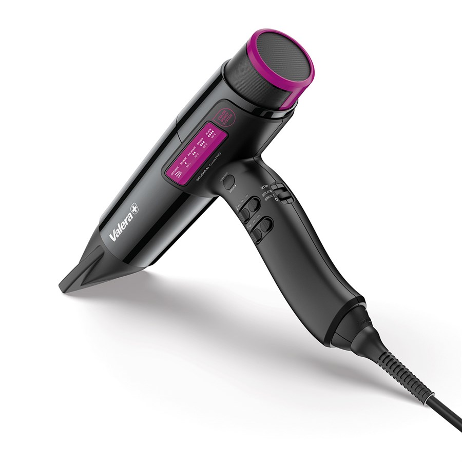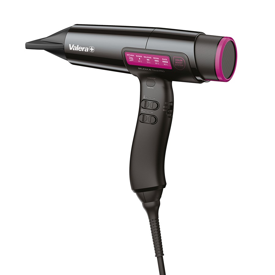 Whether hair is highly bleached or naturally toned, the innovative Selexa AI Color Pro high-speed hairdryer ensures flawless results for every colour service with its advanced display-controlled settings. 5 preset modes allow for fine-tuned temperature and airflow adjustments within an optimal range. In addition, the manual setup offers complete flexibility with nine temperature and airflow combinations. Powered by the durable 120K-PAX digital motor with a lifespan of up to 7,000 hours, the hairdryer delivers high air pressure and a flow rate of 80?m³/h. A CLEAN FILTER function automatically cleans the air intake filter at the push of a button, maintaining peak performance. Selexa AI Color Pro comes with a diffuser and three high-performance nozzles, meeting the needs of individual users and a wide variety of styling techniques.