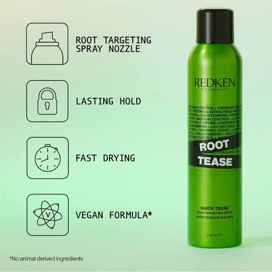 Formerly Quick Tease 15, this professional finishing hairspray has a horizontal mist designed to create lift at the roots, add texture, and control unwanted frizz. Add instant body to any style for an easy backcombed, voluminous, teased effect.